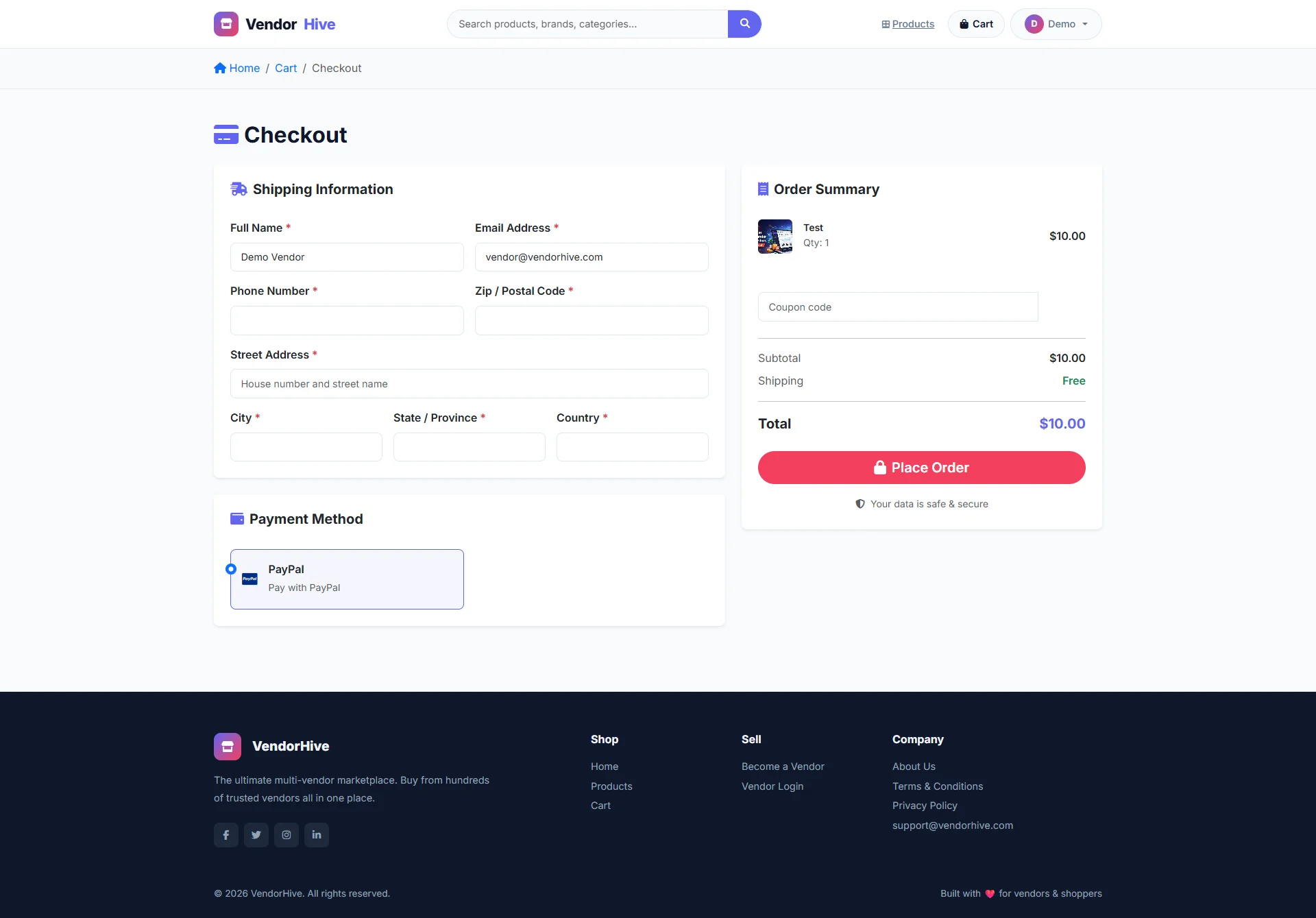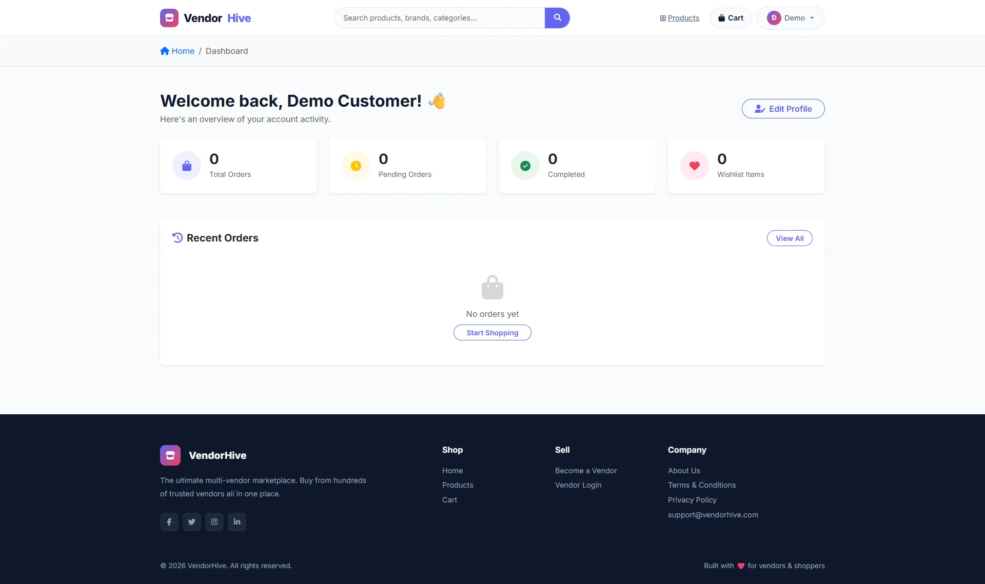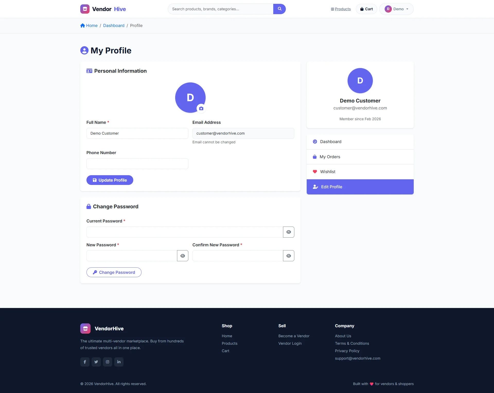 | Customer Login | customer@vendorhive.com | 12345678 |